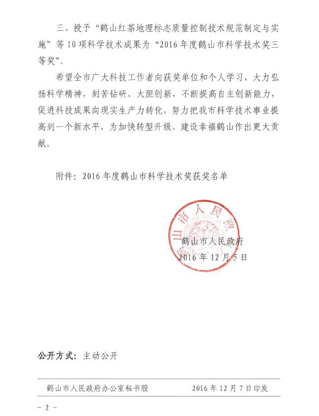 荣获“2016年鹤山市科学技术奖三等奖”